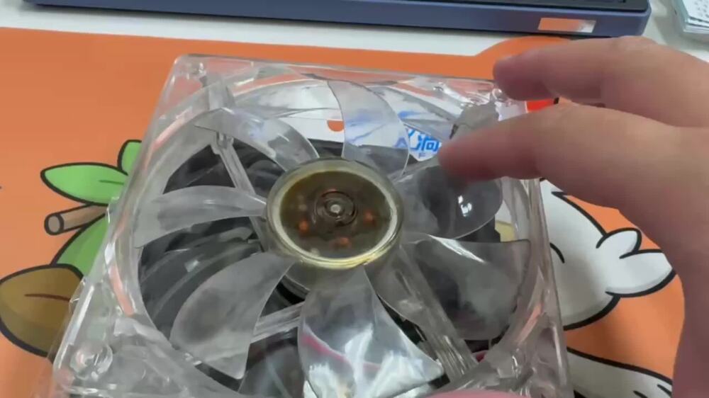 機殼風扇軸承使用 WD-40 解決乾澀卡死問題,最後有再用膠帶將軸承背蓋封起來。